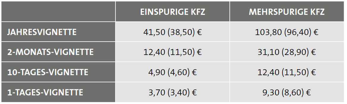 Im Einzelnen gelten für den Erwerb der Vignette für Kfz bis maximal 3,5 Tonnen Gesamtgewicht folgende Preise (inkl. USt, siehe Tabelle). Die 2025er-Vignette gilt von 1. Dezember 2024 bis 31. Jänner 2026. Die „digitale Vignette“, welche an das Kennzeichen gebunden ist, kann wiederum online (z.B. unter http://www.asfinag.at) oder über die ASFINAG-App „Unterwegs“ erworben werden. Hinsichtlich Gültigkeitsdauer und Preise gibt es keinerlei Unterschiede zur analogen Version (sofern es eine analoge Version gibt). Die digitale Version bietet einige Vorteile wie orts- und zeitunabhängigen Erwerb der Vignette, keinen zusätzlichen Aufwand bei Scheibenbruch sowie kein aufwändiges Kleben und Kratzen. Ebenso besteht die Möglichkeit eines Abos für die digitale Vignette – dies ermöglicht bis auf Widerruf die automatische Verlängerung der digitalen Jahresvignette. Für Konsumenten ist bei dem Kauf der digitalen Vignette (wenn es sich nicht um ein Abo handelt) nochmals darauf hinzuweisen, dass die digitale Vignette grundsätzlich erst am 18. Tag nach dem Online-Kauf gültig wird. Diese Frist gilt übrigens nicht, wenn die digitale Vignette an einem ÖAMTC-Stützpunkt erworben wird.